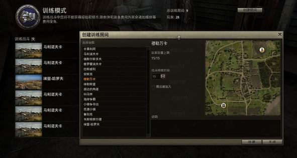 “训练模式”用来训练玩家战斗技术。在这个模式中可以自己选择地图和玩家,在战后战车修复是免费的,所以不能获得经验和银币。