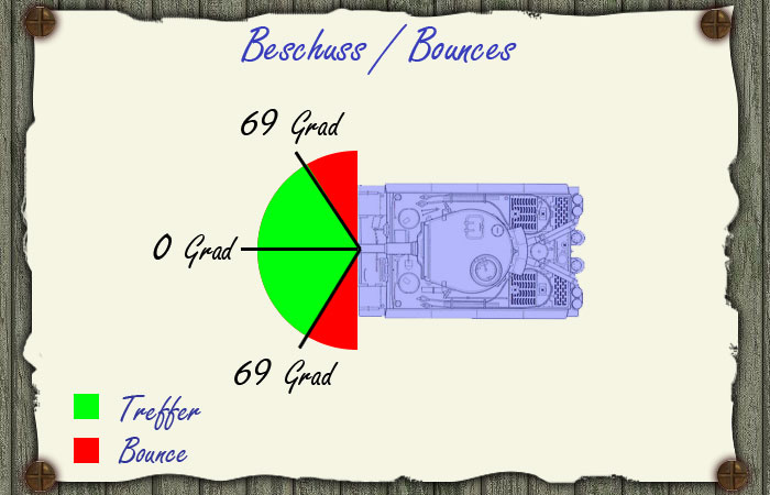 以虎式坦克的垂直板为例….绿色区域是可以击穿的区域.红色区域是跳弹区域..大概是正面左右各69度的样子(倾斜装甲也应该是这样算的..如果射入角和倾斜角大于70就会跳)..