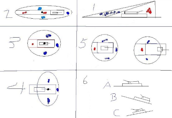 下图中的1号情况是正常一个坦克被抛物线攻击的一个简化图,由图我们可以了解,蓝色那块是无效区,红色是有效区,任何的火炮的攻击为了增加命中的可能,我们就需要在瞄准阶段无限增加红色区域并缩小蓝色区域.