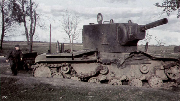 有必要提一下苏军主力最后的奋战:在德第6装甲师被一辆KV-2弄得团团转的同时,扭回头赶来从东侧增援的德第1装甲师和苏第12机械化军、第2坦克师发生了大规模坦克会战。第1装甲师作为德国陆军的精英,装备的全都是较好的3号、4号坦克,但是同样无法撼动KV坦克的装甲。该师第1装甲团的一名士兵如此描述道:“6月24日,在通往列宁格勒的大路上遭遇了可怕的KV1和KV-2坦克,我们连从800米距离开始射击,什么反应都没有。直到50米距离,我们的炮弹还是被弹飞,KV坦克根本不看我们,从我们身边开了过去攻击步兵。结果我们必须掉头在后面追赶!直到30米距离上,我们才能用Pzgr40钨芯穿甲弹从后面打破其中一些!”