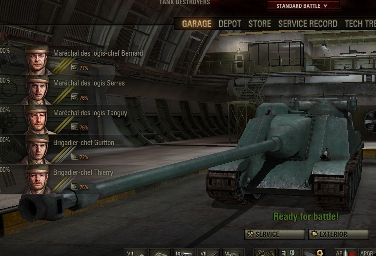 9级TD AMX 50 FOCH 作为一个资深的TD爱好者,我想她就是我苦苦搜寻的梦中情人。继承了8级前辈的大多数优点并将它发扬光大。她真的是全WOT中白板期最短的9级车,白板标配就是120炮,承重能力一如既往强悍的白板悬挂能让你在满配的情况下最后一个研发新悬挂。主炮射速进一步提升,经过换算后射速可达到8发+。随着110射速被砍,要想享受高射速120炮带来的快感,那么只有FOCH能够满足你了。瞄准时间变为1.5秒,这是3突的缩圈速度啊!精度进一步提升。作为一门从8级TD身上继承过来的10级炮,此炮在9级车身上性能有了本质的提升。车身正面达到了逆天的180MM,使得它的车身正面能对260穿以下的主炮构成绝对防护。但是不要对自己的防护过分自信,在这个265+穿深主炮满天飞的9级房里,这个车身正面只是大幅减小了被人正面击穿的可能性。此车唯一的遗憾就是转向和8级的前辈相比略有缩水,不能像原来一样肆无忌惮的调戏MT了。还有一个俯角的问题一直困扰着法国高级TD,哪怕到了9级这个问题依旧无法解决,当你的前面有个坡度不大的小土坡,你不得不翻过那个土坡才能射击,704也有类似的情况。所以在实战中要充分考虑到这类起伏地形给自己带来的不便。或许WG会在之后的版本对FOCH经行进一步削弱,不管她在未来会遭遇怎样的削弱,她都是一个值得你去用心疼爱的TD。