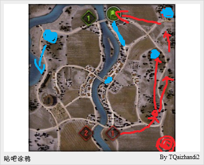 建议沿着图中红线一波流,特别是联队敌人可能会堵住一号位出生点附近的桥拖时间!图中蓝色标记为敌人可能布防区域,扮演进攻方切记不能分兵,每个箭头代表推进的一步,在推进过程中要迅速果断,打流水炮:一人一炮打完就走,别为了一个人头一大堆人停下来(这个野队不做要求)。当你们推到敌人基地开始占的时候敌人估计会沿着蓝色的箭头前进一段路程,不过此时回防已经来不及了,让他们围着地图转圈吧。反正占领成功你们就赢了!火炮跟随大部队推进!