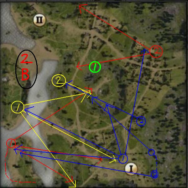 ①:进攻。能打击到山口的敌人侧后,而且对方几乎无暇顾及你,向下露头也能点亮一些人。解决掉小岛的人最好沿红线慢慢摸过去,拉开视野远距离黑枪抄后。途中只有若干小石头供规避直射火力,想防火炮就跑快点躲下面石头那去。