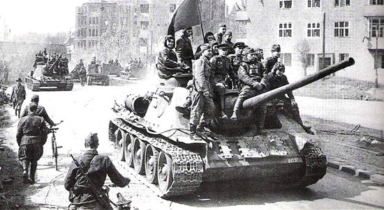 苏联红军第208独立自行火炮旅装备的SU-100坦克歼击车(SU-100装备的D-10S 100mm坦克炮,是在F.F.彼特洛夫领导下完成的杰作。该炮是基于海军的100mmB-34型炮。新型炮的基本型号定名为D-10,坦克型的为D-10T,而自行火炮型的为D-10S,这两种型号仅有很小的区别)。