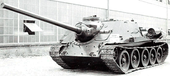 既然SU-100是一个并非经典的经典,那么对其的超越也就不是不可能的了。前文曾经反复强调过,尽管SU-85与SU-100的成功又大大刺激了斯韦尔德洛夫斯克方面的创作欲望,然而完整的坦克设计绝非乌拉尔厂的专长所在,作为一个巨型工业联合企业,生产厂的身份决定了乌拉尔厂至多只能在“组合式创造”这个夹缝中寻求自己的突破。不过,无论对于有炮塔的坦克还是无炮塔的歼击车来说,一个最佳总体布局方案的主要特征永远是这样:没有利用的车内容积最小,能量从发动机传递到行动装置的路径最短,液气管路最短,整个底盘对于全车重量负载均匀。从这个角度来讲,如果允许在一定程度上降低对时间、通用性和可生产性的妥协要求,那么要获得一辆真正令人满意的坦克歼击车(无论对苏联还是德国来说,无炮塔的坦克歼击车都被视为坦克的一种廉价替代品),就必须对于底盘的整体布局进行大刀阔斧的改革,或者干脆研制一种全新的底盘(与坦克一样,总体布置原则上决定了无炮塔坦克歼击车部件的数量及其相互位置、车体和火炮相互结合的方式,进而最终确定坦克歼击车的外形)。然而,研制一种全新的底盘已经超出了乌拉尔厂的能力范围。不过幸运的是,斯韦尔德洛夫斯克方面并不需要去勉强挑战自己的短板——所有的一切已经具备,乌拉尔厂所要作的,只是如何将它们更巧妙的组合在一起。而斯韦尔德洛夫斯克方面是这样想的,也是这样做的。