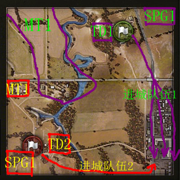 MT2进入了MT1区域的话,则很可能遭到TD1的打击,那是块平原区域,视野开阔没有任何遮挡;MT1进入到了MT2区域的话,TD2不一定能照顾到MT2,有地势原因再加上有些房子什么的。