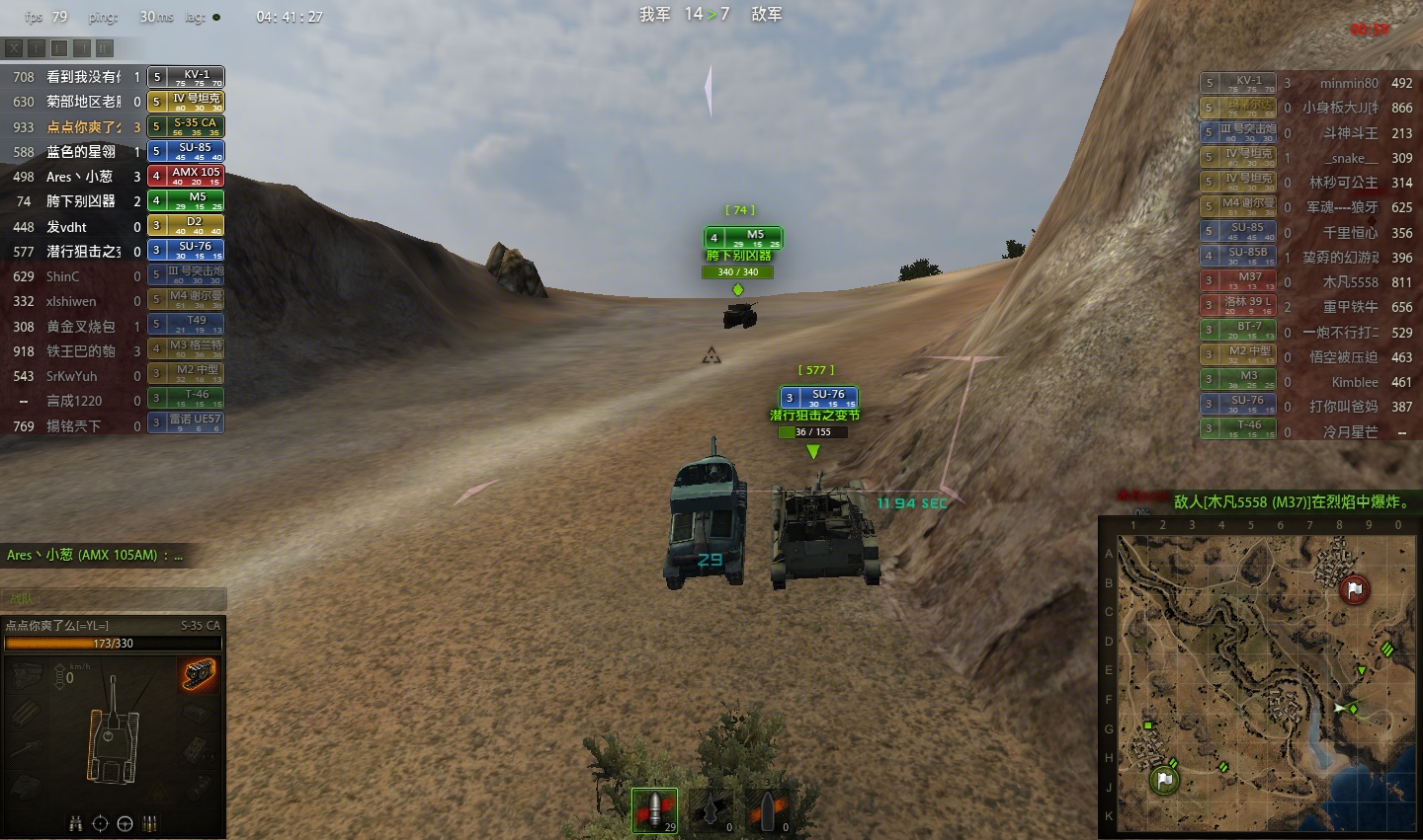在家里通宵练法国TD S-35CA,半夜4点多的时候进了个埃里-哈罗夫,我们出生在下方。开局很和谐,很友好,双方小车都各种抢水,双方TD也各种蹲草丛黑枪,打的不亦乐乎。