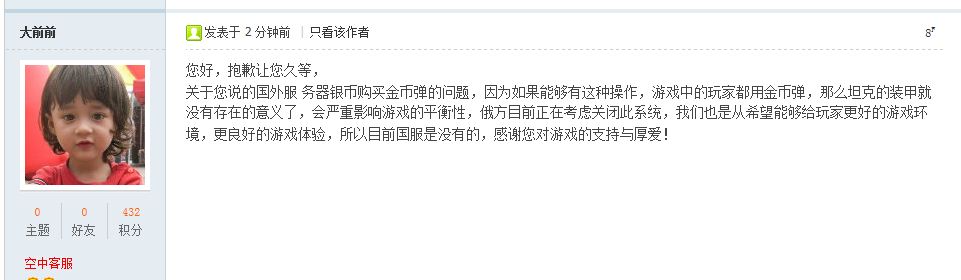关于您说的国外服 务器银币购买金币弹的问题,因为如果能够有这种操作,游戏中的玩家都用金币弹,那么坦克的装甲就没有存在的意义了,会严重影响游戏的平衡性。