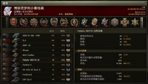 一开始由于有分房保护(8-9,那时候8级车分房还没改),没法和基友配合所以基本都是单野。各种被卖被轮被围观..胜率惨不忍睹。外加这车用着确实不爽,所以后来也就常年丢车库吃灰了..