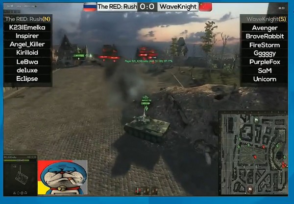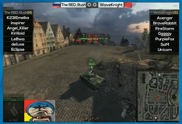 这一阶段虎豹骑的指挥显然下定决定调整山下重坦群的阵型主动发起进攻,具体是IS3走8线后左转与D线的对手交战,2台T32则直接移动到中间的喷泉处准备看情况发起支援,俄罗斯队的反应也是相当迅速,D5处的重坦进掩体龟缩防守,D3处的重坦往地图下方移动准备从侧面打击虎豹骑在中间喷泉处的 2辆T32,原先在B3的HT则顺势下移到D3处准备和D5处的重坦从D线道路的2边用交叉火力对付虎豹骑从8线过来的IS3。注意这里的一个细节:虎豹骑的IS3过早左转完全进入了D线小道,这给它日后摆脱交火造成了极大的困难!究其根本原因,则是因为虎豹骑在之前的试探阶段中并没有发现俄罗斯队在山下的全部兵力,至少我能确定俄罗斯队在B3的重坦在虎豹骑的重坦们发动进攻前一直没有被侦查到。很明显,这次俄罗斯队又成功地隐藏了自己的部分主要兵力。这还没完,俄罗斯队在山顶拖后的一辆50 100在观察到虎豹骑的2辆T32前进到中间喷泉处后离开了原先的防守阵位到山边上,看上去像是要黑枪打击山下的T32。但是啊!但是,这个50 100的举动从后面的形势发展来看,更像是一个经过精心思考的trap(陷阱)!俄罗斯队的指挥不会不知道满血的时候法国车跟法国车的对决中弹夹中炮弹少的一方总是居于劣势的,那为什么还分兵去山边上黑枪呢?答案只有一个:引诱虎豹骑的50 100进攻,50 100在山边上只是起一个黑枪打1发削减山下T32血量给T32造成压力,同时,留了4发炮弹(第一发炮弹已经在试探阶段送给了虎豹骑贸然露头的第一辆 50 100)准备好好招待虎豹骑的那两辆50 100。于此同时,第二个致命的细节请大家注意了:THE RED的一号T1已经到达K2的位置,它之所以如此大胆是因为THE RED在先前的试探中已经侦查到了虎豹骑的全部兵力了,很明显基地周围的旗圈附近没有虎豹骑的任何一辆车,而待会它就将成为虎豹骑这边的腋下之痒,不管不顾的话则会发展成为心腹大患。