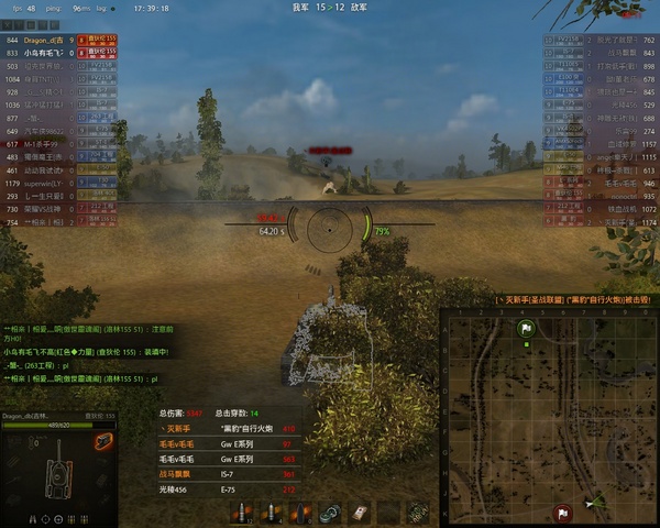 本人今天练查狄伦155自行火炮遇见我开火炮生涯的一次最惊心动魄的一局,很可惜电脑渣滓录像不可能.....所以就先上图图吧这张常规地图相信大家经常玩到,战局很激烈,我方就剩,俩XX155,洛林155,51,残血-7,对方剩个残血-7,残血75,豹子炮,E炮。对方75与我方-7互亮后