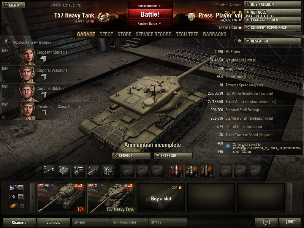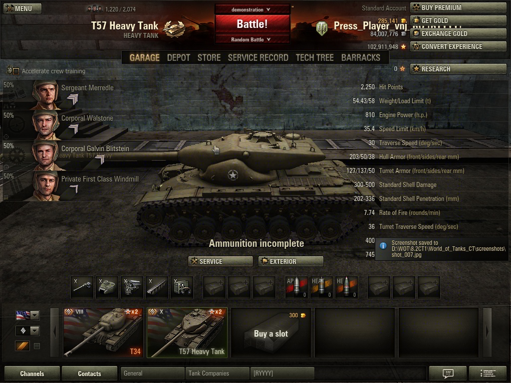 重点来了! 二测的T57H,车体正面装甲由127升至203!!! 直接就拥有了E5的首上防御能力,经过情报组的简单测试后,现在T57H首上几乎免疫270一下的穿深,270穿深的炮也只能保证15%-20%的击穿率。(首下依然纸糊 175穿深的炮10打10穿)