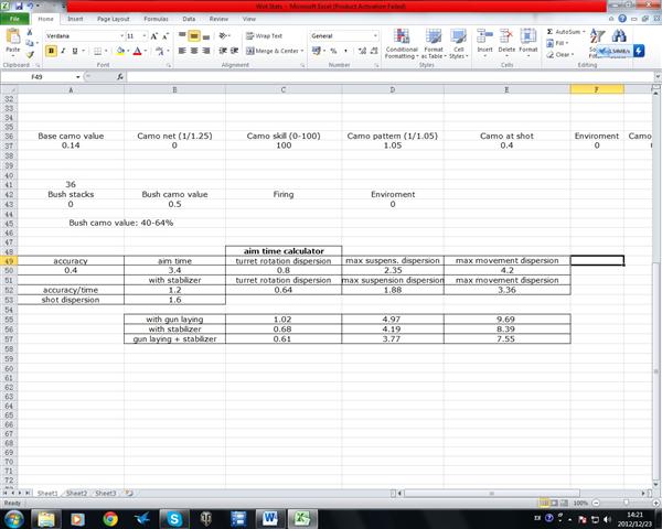 (炮塔转动/车体前后移动/转动的扩圈值 乘以 0.8 减 精度) 除 (开炮后的扩圈值 减 精度) 乘以 瞄准时间 乘以 0.9