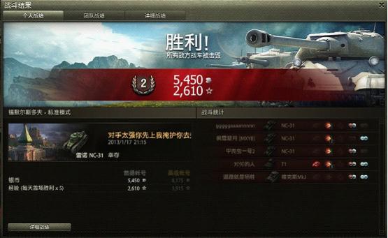经过一场激烈的大内战后,因为队友太给力了没打几炮就碾压了对面。