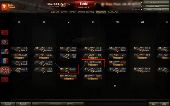 在更新后的坦克科技树中,广大玩家朋友将看到全新的变化。对于Y系精英而言,值得一提的是5级(一个经常成为小车房“班长”的级别)重坦“丘吉尔”I型将研发出Y系一辆6级自行反坦克炮:“丘吉尔”GC(消耗经验:49050),该战车将研发出随后的7级自行反坦克炮AT 7,并最终可以研发出新版本中的直射火力之王:FV215b(183)。