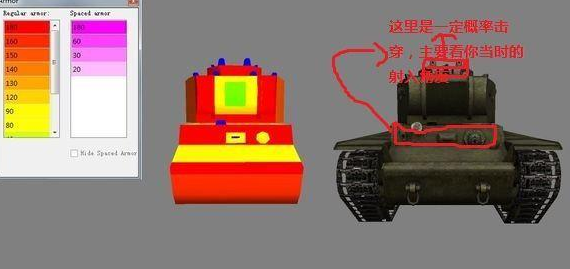 虎王的穿深好像是200多,具体数值楼主不记得了,反正虎王打-6可以炮炮穿,这个时候我们要做的是手动跳蛋,首先你要给他做个假象,你车身趁35°对着他,这个时候,虎王会选择打你肩膀或者正面。