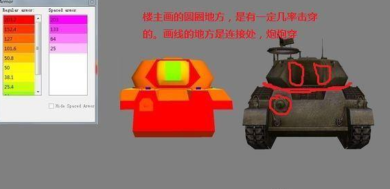 上面的图,是-6正面弱点图,其中我标记的炮盾左侧,相信大家有很多人不知道。经过楼主和基友的训练房实测,这个地方10炮穿了6炮。下面我来给大家说说如何做到有效击穿这几个地方。
