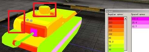 红圈圈出的两个都是正面的弱点,尤其是右肩的巨大的89mm垂直装甲,很容易击穿,而且目标巨大。