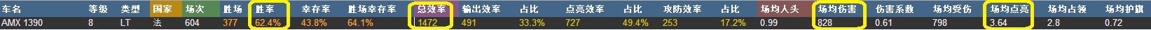 4、轻坦绝不无脑肉侦,做好首亮配合适量输出,保证单车高胜率,是轻坦高战斗力的要点,见本人1390数据,胜率有一部分受益于高联,单野胜率也在58%上下。基本符合一个轻坦的本职工作,如果前半场就开始黑枪,场均伤害可以保证1000+,单车战斗力却比现在这样要低很多。
