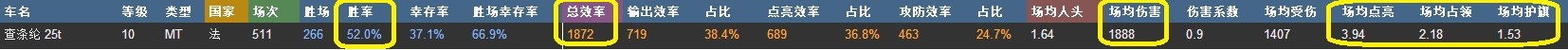 参考下图我这个菜蛋查狄伦的数据,从场均点亮,输出,占领和护旗上可以看出我基本是开局飘一下看看对方分布,游走输出,中后期查缺补漏的常规打法,一直不适应这个车的俯仰角,胜率只有可怜的52%(作为控场型中坦这个胜率是很低的),单车战斗力却有1872,前面说过我如果想刷战斗力一个月可以再提高300点,假设我的查狄伦再连续玩3000场,不玩其他任何车,单车战斗力可以稳定在2000+,根据等级权重,这3000场10级车会对我总战斗力有明显影响,总战斗力上升到1500+是非常现实的(因为现在10级车总场次不足1000场)。