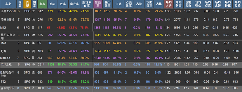 个人玩的感觉不错的,首推151——然后自走黑豹--M4043也不错--最后是261.……本来155很爽地,经常N多版本的DBUFF已经费了,过500米那准度愁人,血量还有刺刀能力跟最早出车的时候完全像二个火炮。(想当年500场的时候51%的命中+59%的胜率+近2600的场均,现在效率还能1135完全是吃以前的老本,真心感觉全面不如151的说)。