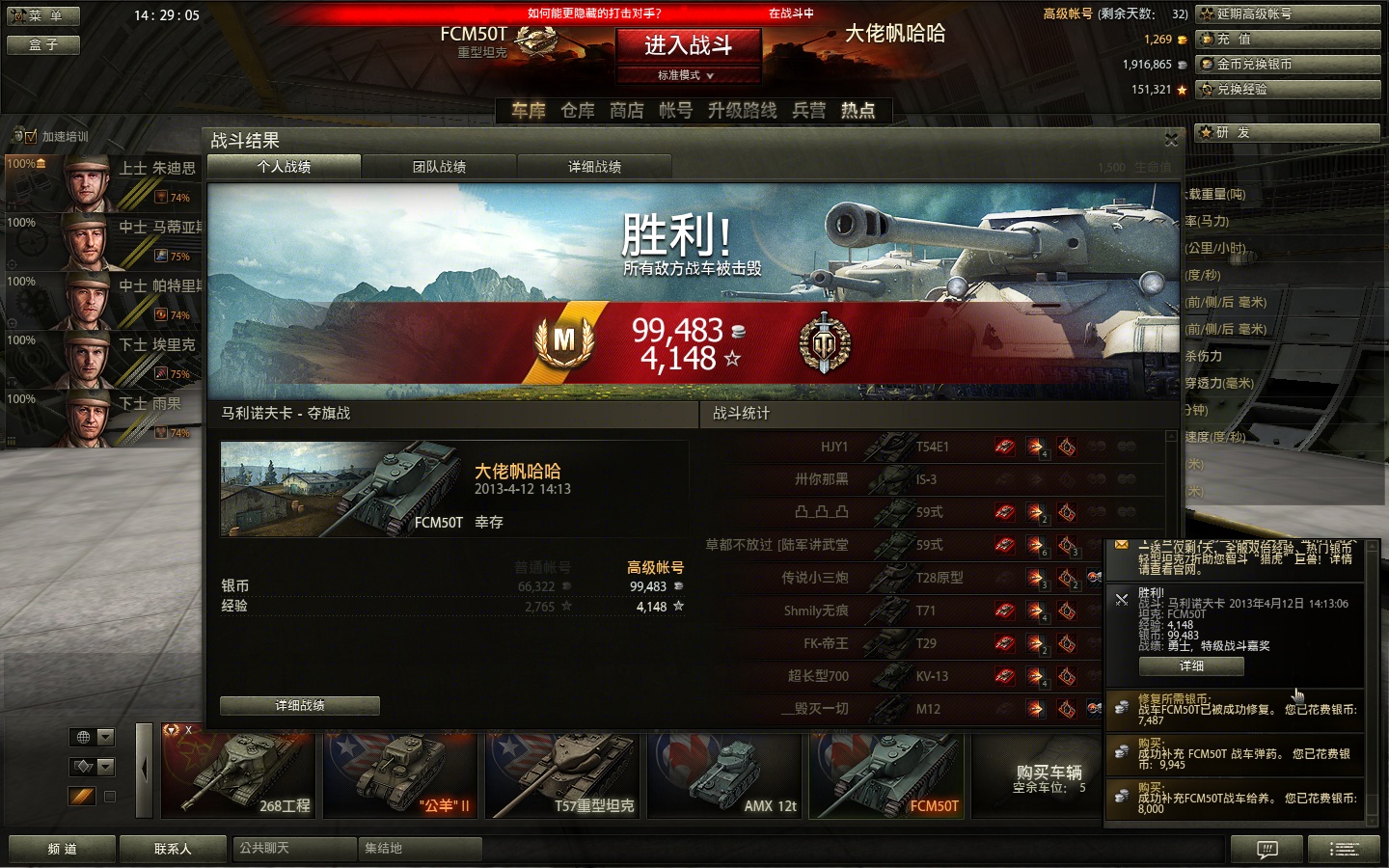 (这里要着重强调一下,撞车虽爽但是要理性对待。由于这车装甲薄,撞起来别人痛自己也好不到哪里去。不像KV5这种撞他身上死掉他却没掉血的主。像那些开的飞快的残血肉侦车如果有把握打死最好还是打死而不要去撞,有时候会得不偿失。)