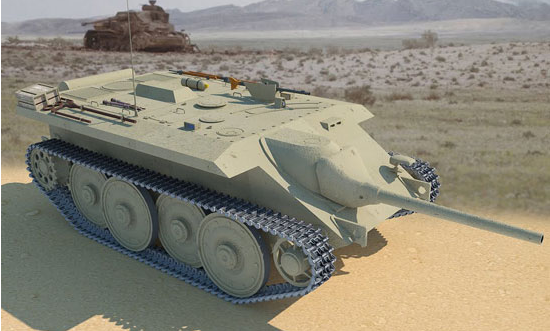E-10高性能轻型战车——KHD公司的“驱逐战车38(D)”用于取代“追猎者”。它采用38(D)坦克底盘,原型车装75毫米Pak39 L/48炮。生产型装75毫米L/70炮,战斗力和“黑豹”相当,正面装甲80毫米厚,倾角和“追猎者”相同。该车有几处创新:一是发动机,采用“梅**”HL64燃油喷射式发动机。二是悬挂,为“全轮独立式液压悬挂”,时至今日也只有法国的“勒克莱尔”坦克与之类似;三是变速装置和发动机后置使维护简捷,同时加大了战斗室的有效空间。这种E-10的外形紧凑,全重16