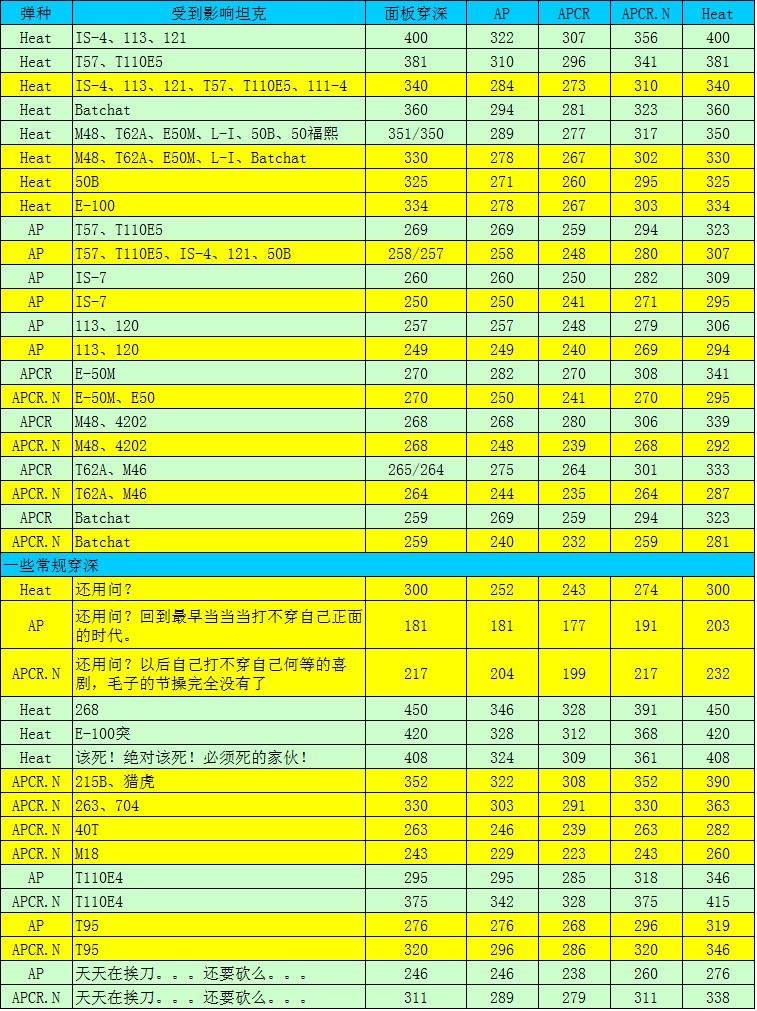 常规穿深列表中,基本上把T9~T10的穿深列举了。