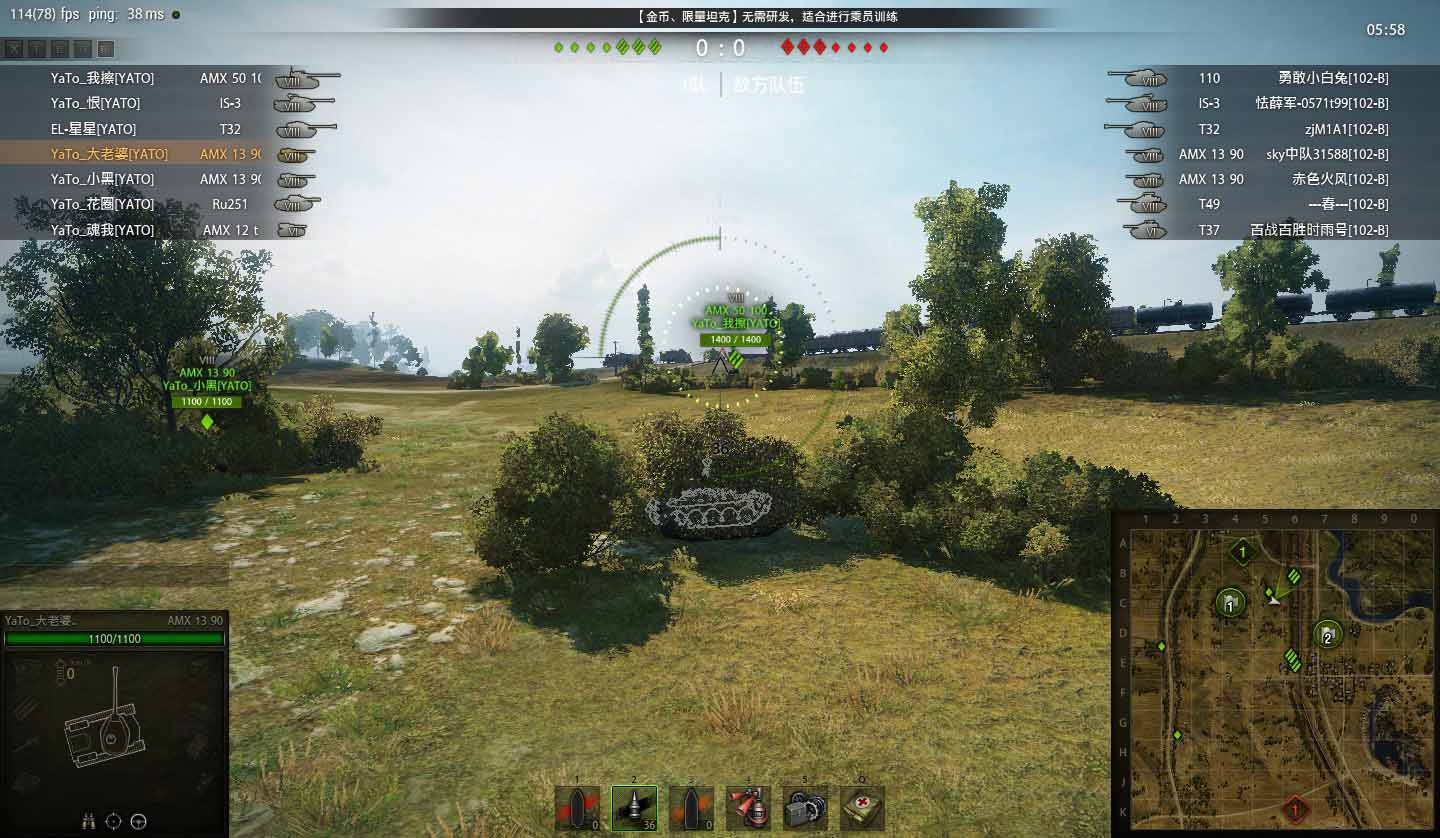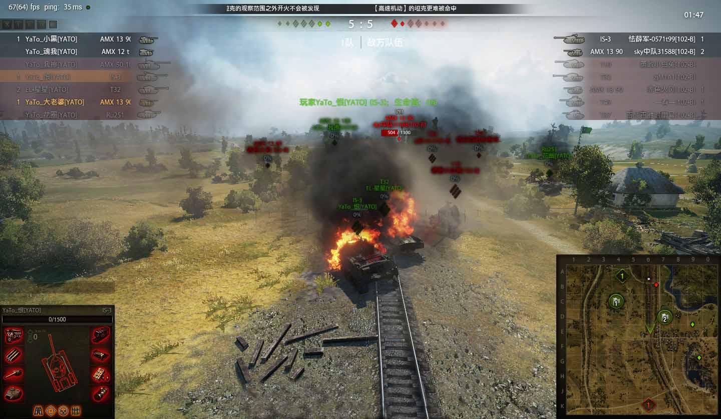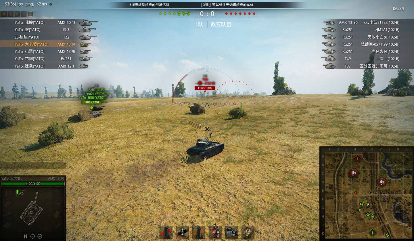 第一局:YATO下出生点出生,进攻方。开局YATO主力在出生点布防,以防VG犀利的快攻战术,侦察车则不断地在要点侦查,以警戒VG的动向。5分时,在J7点与VG先头部队遭遇,双方随即展开交火,由于YATO布防较开,占有一定地利优势,在连续两次的断带射击下集火带走小白兔,略占小优,一轮射击后,YATO探明VG全部布防于6线铁道以东,并利用地形及VG装填的真空时间,果断转场进攻1号基地。YATO进攻转场迅速,2台轻坦利用地形占领基地,其余则在分布在E2、E3可攻可守。YATO此举令VG始料未及,VG回防过于匆忙分散,被YATO利用地利打了一个防守反击,最终YATO拿下此局。YATO 1:0 VG.天喔。