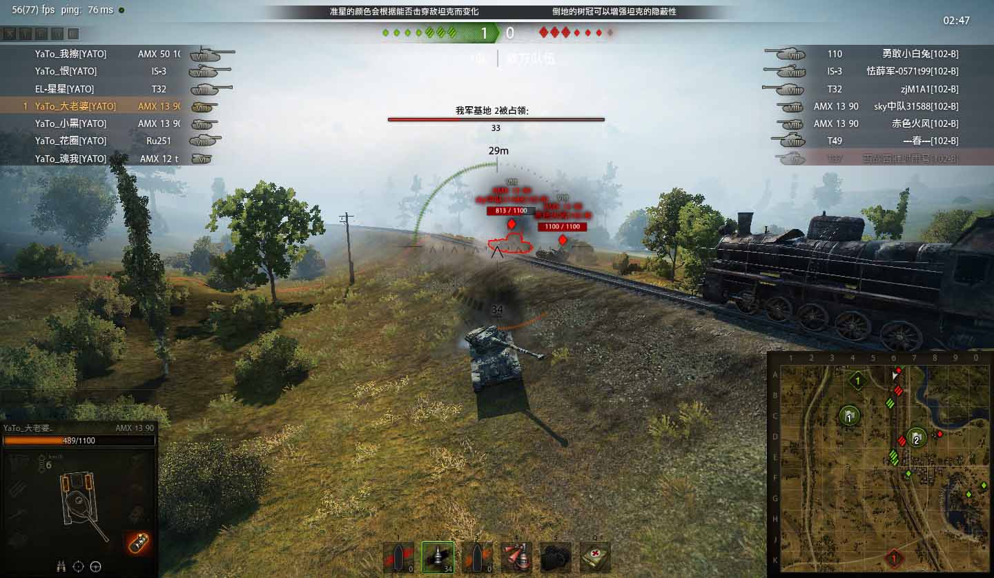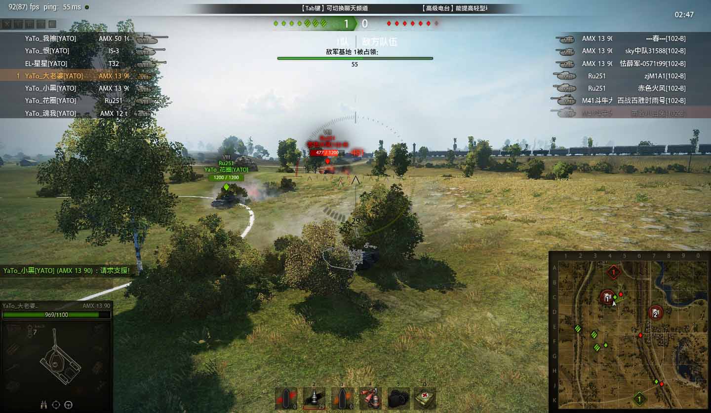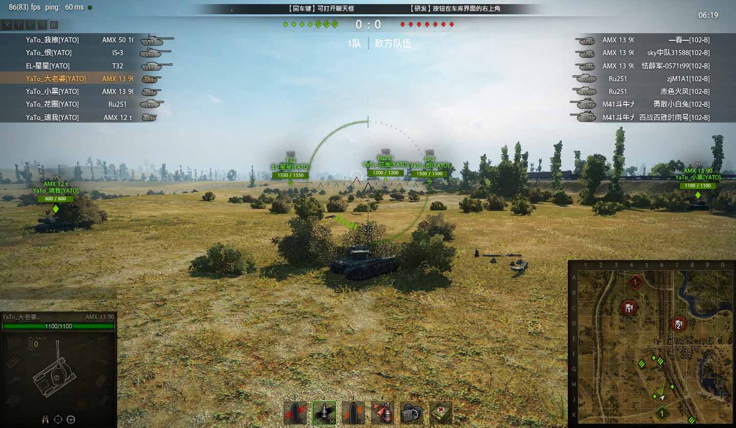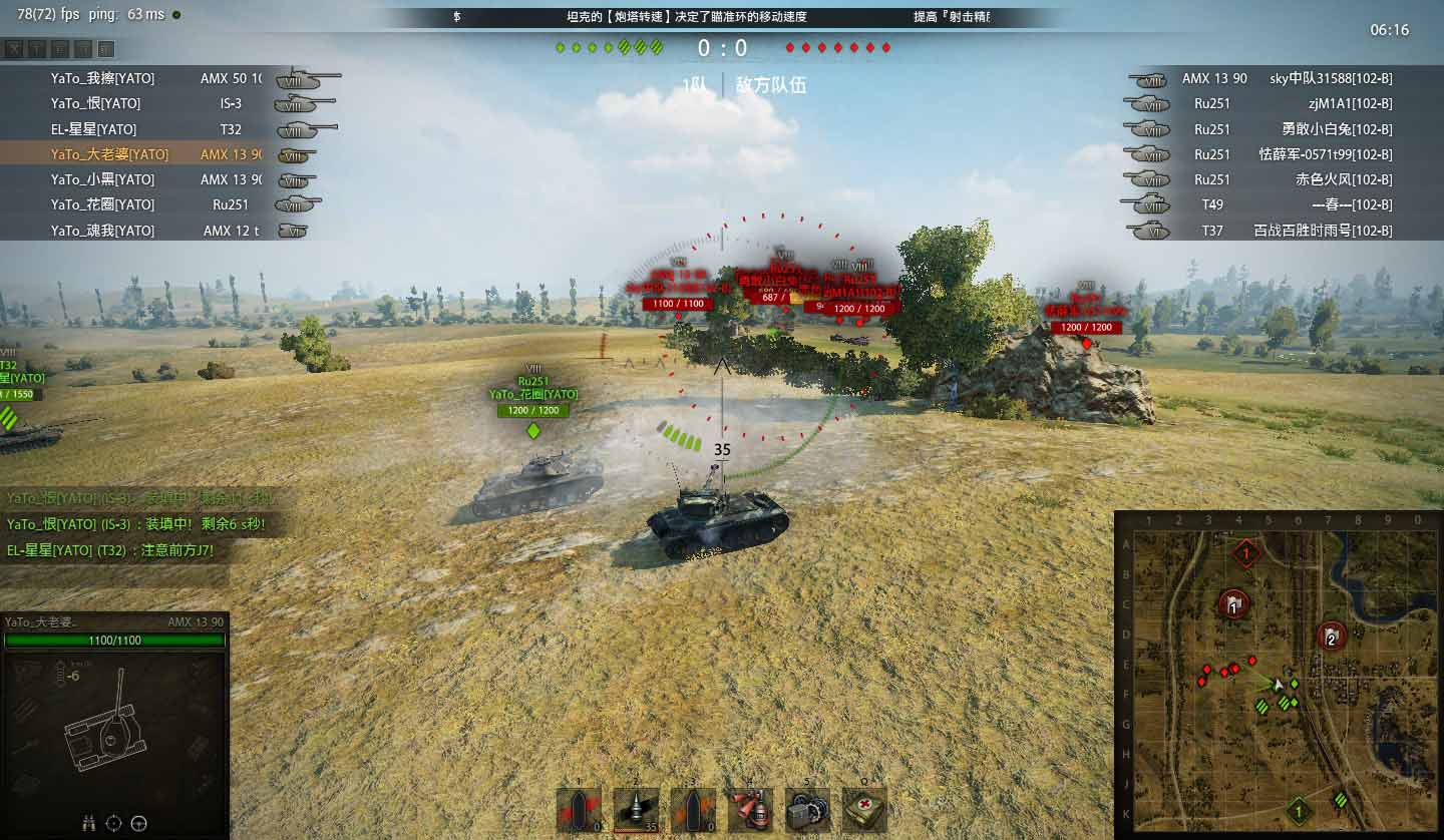 第一局:YATO下出生点出生,进攻方。开局YATO主力在出生点布防,以防VG犀利的快攻战术,侦察车则不断地在要点侦查,以警戒VG的动向。5分时,在J7点与VG先头部队遭遇,双方随即展开交火,由于YATO布防较开,占有一定地利优势,在连续两次的断带射击下集火带走小白兔,略占小优,一轮射击后,YATO探明VG全部布防于6线铁道以东,并利用地形及VG装填的真空时间,果断转场进攻1号基地。YATO进攻转场迅速,2台轻坦利用地形占领基地,其余则在分布在E2、E3可攻可守。YATO此举令VG始料未及,VG回防过于匆忙分散,被YATO利用地利打了一个防守反击,最终YATO拿下此局。YATO 1:0 VG.天喔。