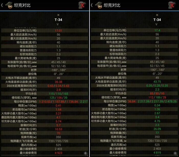 T-34所处分房为低级向中级进阶的环境,且正是培养包抄绕后意识的时间。所以,穿深不是那么重要,伤害也不是那么重要;重要的是,T-34这车的机动,以及T-34经常遇到敌人的装甲并不高,在低级房中需要的是精度和射速的配合。这个实例告诉我们:不要光看纸面数据,只有实际的体验,才能找到真正适合这辆战车定位的主炮。如果说不了解一些隐藏数据,可以通过下面我给的链接用手机下载一个数据库,可以提前进行对比,也可以了解是否不更换悬挂就能更换炮塔和主炮。