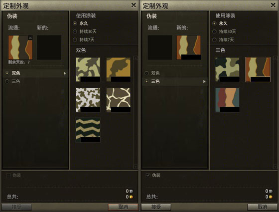 玩家在车库内,点击车辆下方的“涂装”按钮,即可进入涂装界面。迷彩分为双色迷彩、三色迷彩两种,价格也有所区别。同时,迷彩涂装时间也分为7天、30天、永久三种,玩家根据不同需要进行选择。